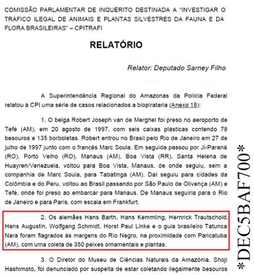 - "COMISSÃO PARLAMENTAR DE INQUÉRITO DESTINADA A `INVESTIGAR O TRÁFICO ILEGAL DE ANIMAIS E PLANTAS SILVESTRES DA FAUNA E DA FLORA BRASILEIRAS´ – CPITRAFI - RELATÓRIO" - Relator: Deputado Sarney Filho - Brasília, DF - Brasil;
