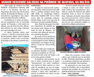- "Akakor descobre galerias na pirâmide de Akapana, na Bolívia" - Informativo da Sociedade Brasileira de Espeleologia SBE NOTÍCIAS, número 98 - set/2008.