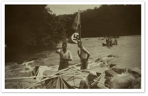 A Amazônia esteve nos planos de Hitler como um território a ser conquistado pelo III Reich. Uma enorme cruz de madeira ostenta uma suástica nazista no cemitério de uma ilhota sem nome do Rio Jari, entre os estados do Amapá e Pará. É o que resta da expedição nazista que chegou a Belém em 1935 e durante dois anos explorou a geologia, fauna e flora da Amazônia. Preparando a invasão Um livro de 1938 achado recentemente num sebo em Berlim traz anotações precisas da expedição. Intitulado "Mistérios do Inferno da Mata Virgem", o diário do geologista e piloto Otto Schulz-Kampfhenker revela que os quatro oficiais alemães teriam outros interesses que os científicos - buscavam os acessos e caminhos do Amapá até a Guiana Francesa, região estratégica a ser ocupada na guerra que se aproximava. Os exploradores levaram 11 toneladas de suprimentos e munição para 5 mil tiros. Enviaram para a Alemanha as peles de 500 mamíferos diferentes, centenas de répteis e anfíbios e 1.500 objetos arqueológicos. Produziram 2.500 fotografias e 2.700 metros de filme 35mm que mostram índios, caboclos, animais, peles, cobras e outros espécimes exóticos do mundo tropical. Eles também aproveitaram para testar um hidroavião com flutuadores de compensado de madeira, técnica inédita na época, e algumas armas e equipamentos não detalhados no livro."Papai grande"A missão foi repleta de incidentes. O piloto errou duas vezes a rota de Arumanduba, de onde partiriam.